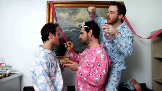 8 guys all go over to Pete’s house for binge-drinking night. Lots of beers are consumed; they stack the cans and tape them on top of one another (Wizard Sticks!), to show who is the most loaded. Someone crashes through a coffee table, another burns himself on that cigarette they forgot they had lit. Hockey and that “slut that puts out for everyone” is talked about a lot. Once the alcohol fully sets in, one of them gets over emotional about their job, and tries to have a one on one chat about how he deserves to be recognized more, and how he really loves his boss. Ending in a mystery puke/shit in the bathroom sink that, for some reason, no longer drains properly.
