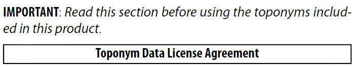 I’m no retard, but I had to look this word up. I needed to find out what kind of data license I was agreeing to. After finding that toponym means “a place name,” I find that I still have no idea what the fuck they are trying to say. I ripped this page out of the manual and fed it to my dog for his birthday.