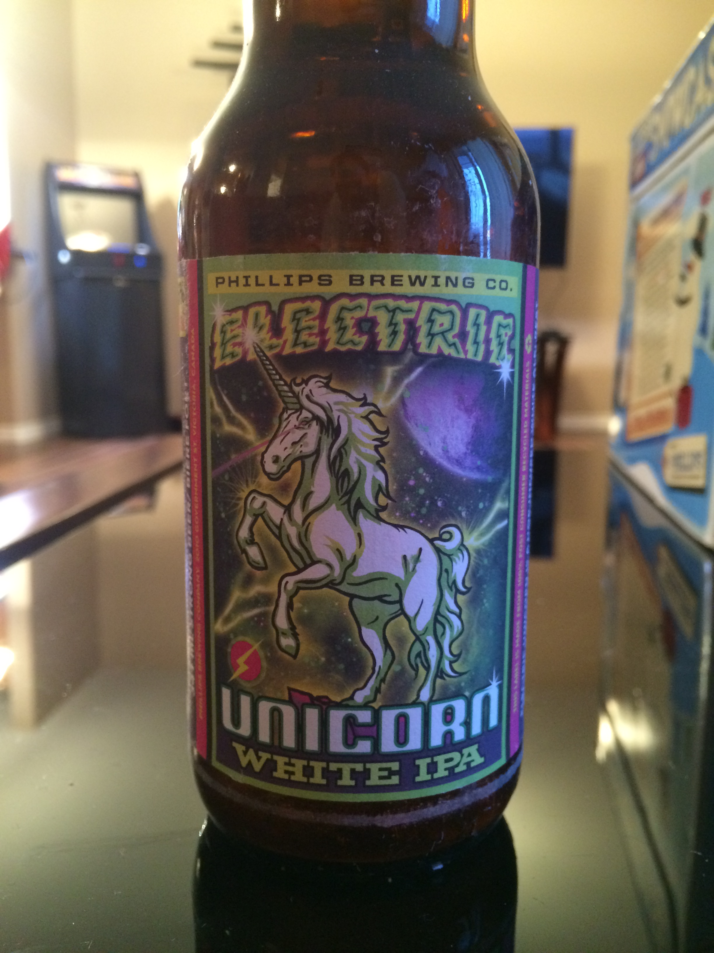 Label Blurb: ELECTRIC UNICORN IS A HOP-INFUSED WHITE ALE; BEST ENJOYED WHILE RIDING A MYSTICAL MONO-HORNED LASER BEAST, RACING THROUGH THE GALAXY TO THE SONIC BACKDROP OF SCREAMING METAL GUITARS.