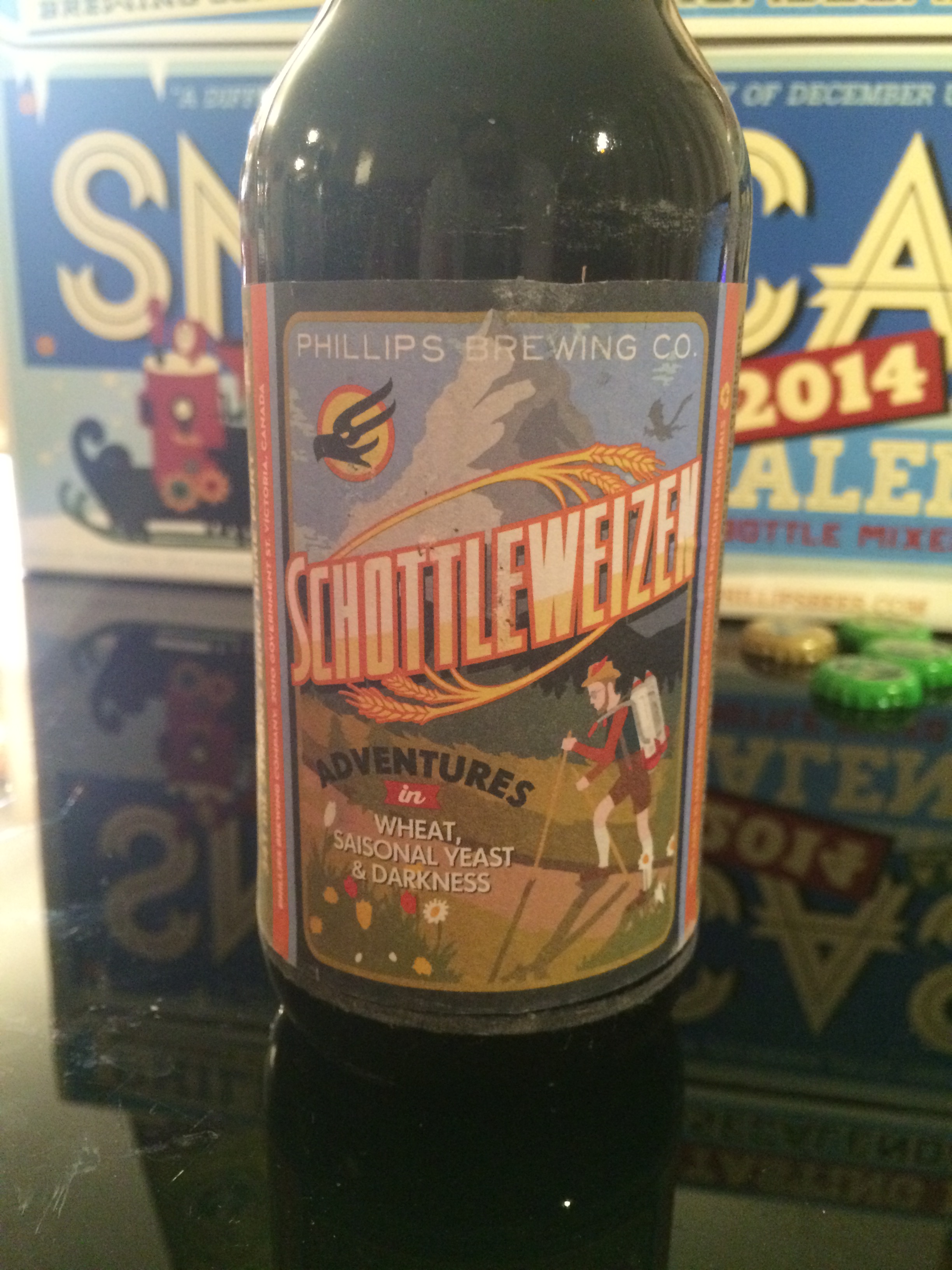 Label Blurb: THIS IS A BEER THAT WAS DREAMT UP BY OUR RESEARCH BREWER WHO BROUGHT IN A HOMEBREWED VERSION THAT BLEW OUR SOCKS OFF! A HEALTHY AMOUNT OF WHEAT (‘WEIZEN’ IS THE GERMAN WORD FOR WHEAT) AND DARK ROASTED MALT ARE FERMENTED WITH SAISON YEAST, AN EXCITING STRAIN FAMOUS FOR ITS SLIGHTLY SPICY AND COMPLEX CHARACTERISTICS. IT’S SUCH A UNIQUE COMBINATION AND WE THOUGHT IT ONLY FAIR TO NAME OUR RELEASE AFTER THE MAN WHO DREAMT IT UP! THUS THE SCHOTTLEWEIZEN WAS BORN!