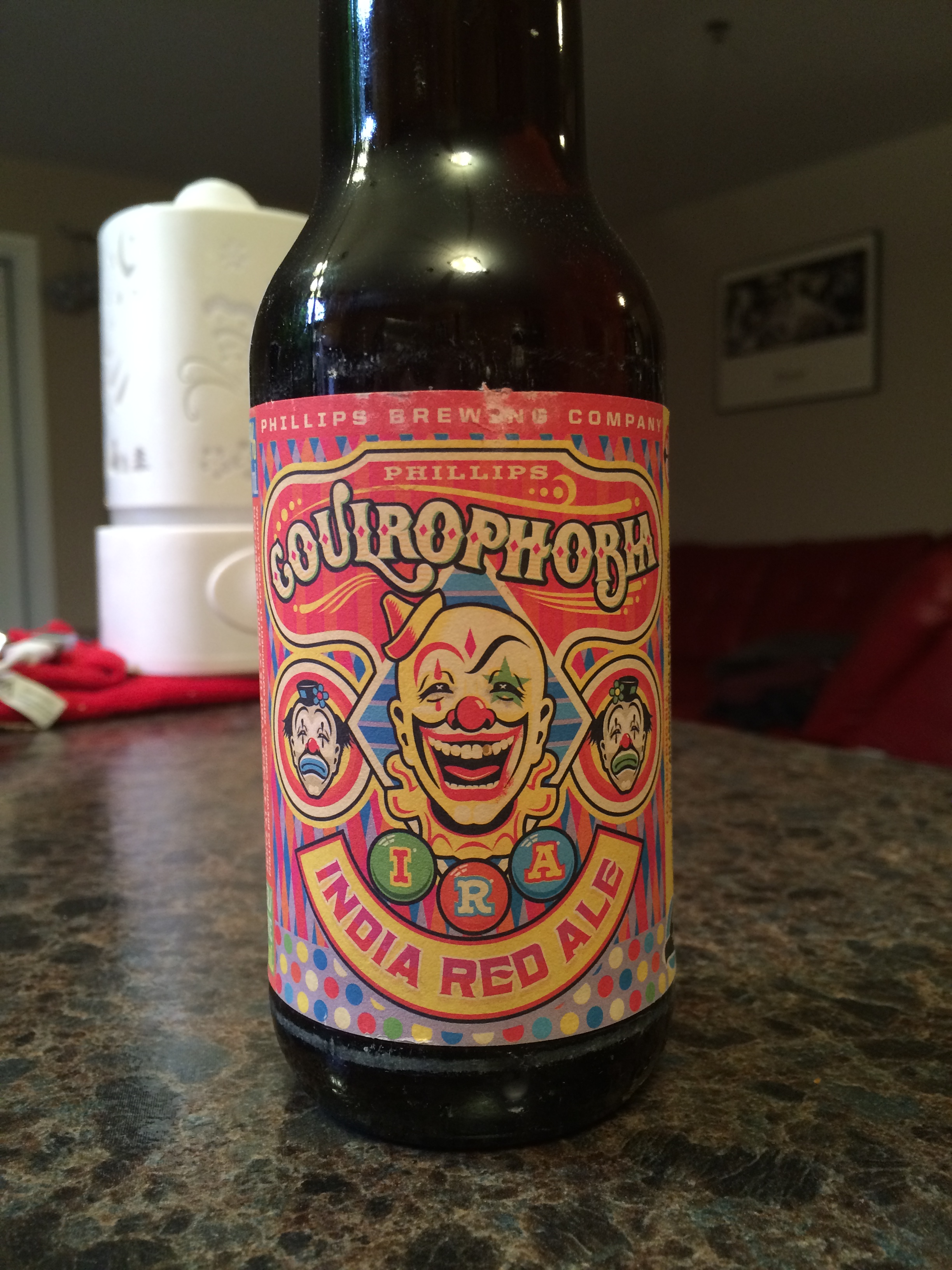Label Blurb: SCARED OF CLOWNS? US TOO, BUT IT’S TIME TO FACE OUR FEARS. COULROPHOBIA INDIA RED ALE JUGGLES FRESH PINE BITTERNESS WITH HINTS OF CITRUS FRUIT. POURING DEEP REDDISH-COPPER COLOUR WITH A MARSHMALLOW WHITE HEAD, ITS FRESH, FULL AROMA MAY JUST CHANGE YOUR MIND ABOUT BIG NOSES. DELICATELY BALANCED WITH A HEARTY MALT BASE, YOU’LL SMILE AT THE AMOUNT OF BODY WE SQUEEZED INTO THIS FLAVOUR VEHICLE; NO CREEPY FACE PAINT REQUIRED.